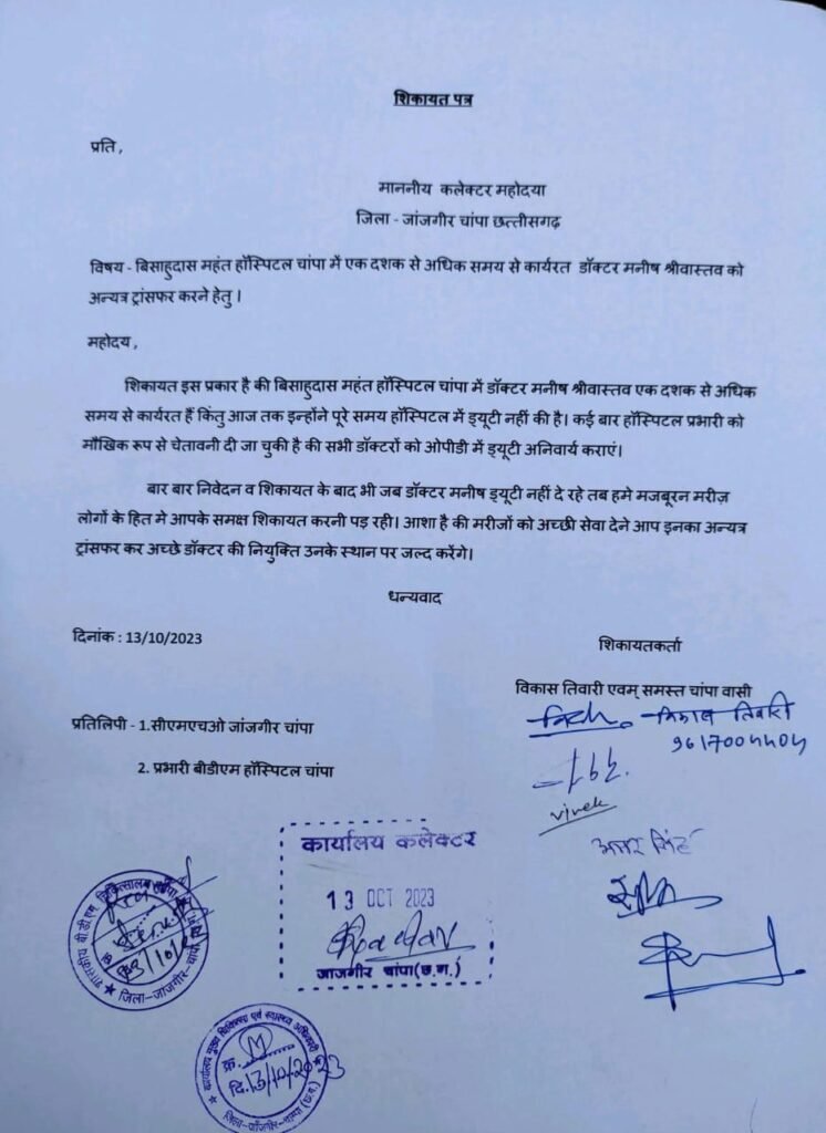 यह पहला मौका नहीं है जब डॉ. मनीष श्रीवास्तव को लेकर सवाल उठे हों। इससे पहले, जब वे बीडीएम अस्पताल चांपा में पदस्थ थे, तब स्थानीय नागरिकों ने कलेक्टर को लिखित शिकायत सौंपकर आरोप लगाया था कि वे ओपीडी में नियमित रूप से उपस्थित नहीं रहते थे। शिकायत में कहा गया था कि डॉक्टर की अनुपस्थिति के कारण मरीजों को घंटों इंतजार करना पड़ता था और कई बार बिना इलाज के लौटना पड़ता था।
