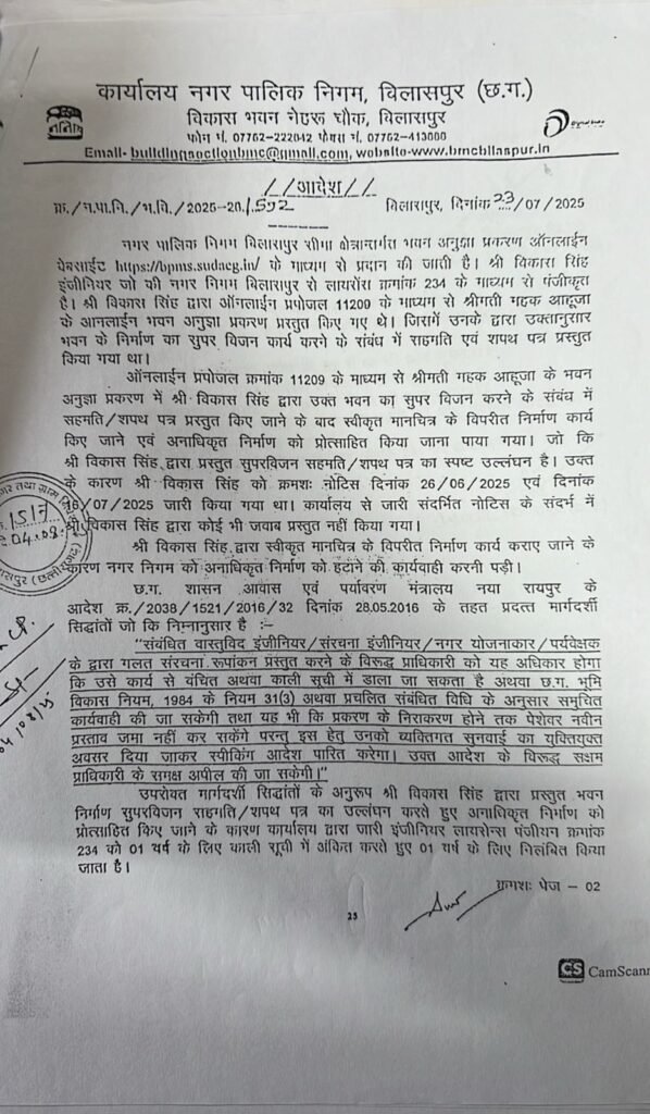 इस पूरे मामले का दूसरा चौंकाने वाला पहलू उस आर्किटेक्ट या इंजीनियर का नाम है जिसके माध्यम से यह नक्शा तैयार किया गया। दस्तावेजों में ‘विकास सिंह’ नाम दर्ज है। लेकिन बिलासपुर शहर में इस नाम का कोई पंजीकृत आर्किटेक्ट या इंजीनियर उपलब्ध ही नहीं है। नगर निगम के रिकॉर्ड और पेशेवर संस्थाओं से प्राप्त जानकारी के अनुसार इस नाम का कोई भी व्यक्ति आधिकारिक रूप से वास्तुकार या इंजीनियर के रूप में पंजीकृत नहीं है। यह तथ्य भी सामने आया कि इसी नाम का उपयोग पहले भी कई निर्माण परियोजनाओं के फर्जी नक्शे स्वीकृत कराने के लिए किया गया था। बाद में जब इस पर संदेह गहराया तो नगर निगम ने इस नाम से जुड़े लाइसेंस को निलंबित कर दिया था। इसके बावजूद उसी पहचान के आधार पर एक बड़े प्रोजेक्ट को मंजूरी मिल जाना इस पूरे तंत्र की पारदर्शिता पर गंभीर सवाल खड़े करता है।
